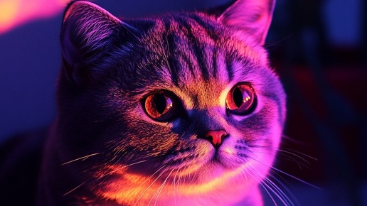 Создано на основе запроса: scottish fold cat picture so that the light reflects colors sunset 1E073D 5600E3 5A1BA0 61DFFF 7F29FF 93D2F7