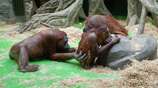Семья борнейских орангутанов в Московском зоопарке.