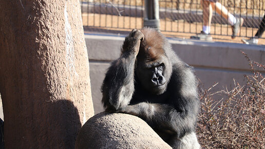 Гориллы смешно прячутся от дождя в зоопарке: видео