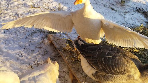На улице у нас были уже морозы в минус 35 круглосуточно около 4 дней подряд, а мои пернатые целый день гуляют. Хотя "гуляют" — это громко сказано. Они выходят из сарая, расправляют крылья, взмахнут ими пару раз и плюхаются пузом в снег. Лапки под крыло повыше и всё, так и сидят. Я выношу им воды, чтобы напоить, а то снегом жажду сложно утолить. Подходят, пьют и умываются — неважно, что на улице минус и вся вода на перьях превращается в лёд. Позже снимут, когда пойдут перья чистить. Во дворе у меня поддоны, на них сено...