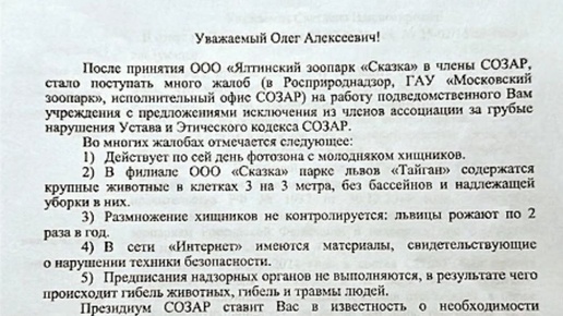 5 февраля 2025 года Акулова Светлана Владимировна написала официальное письмо от имени своей организации "СОЗАР", в котором написала дословно следующее: "После принятия ООО «Ялтинский зоопарк «Сказка» в члены СОЗАР, стало поступать много жалоб (в Росприроднадзор, ГАУ «Московский зоопарк», исполнительный офис СОЗАР) на работу подведомственного Вам учреждения с предложениями исключения из членов ассоциации за грубые нарушения Устава и Этического кодекса СОЗАР. Во многих жалобах отмечается следующее: 1) Действует по сей день фотозона с молодняком хищников...