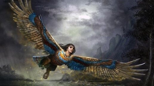 Стратим-птица (или Строфиль-птица) с человеческим лицом. Родилась из золотого яйца, снесённого Мировой Уточкой. Считается, что именно от нее пошли все птицы и птицелюди, она является их прародительницей. Откуда она прилетела на море-океан, на Белый камень, никто не знает. Птица воплощала самые разрушительные силы природы. Крик ее настолько сильный, что вызывает страшную бурю. Стратим-птица слегка взмахивала крылом и море начинало волноваться, кричала - поднималась буря, а когда летела - закрывала собой белый свет...