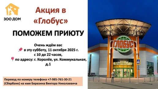 Приглашаем принять участие в очередной акции по сбору гуманитарной помощи в пользу хвостиков нашего приюта💌 📍Акция пройдет в эту субботу (11-го октября) с 10.00 до 22.00 в гипермаркете Globus (Королев, Коммунальная улица, д. 1). Наши волонтеры будут стоять с двух входов / выходов Наш ТОП-нужд : 🐶Крупа гречневая и рисовая 🐶Птичьи головы, шейки, желудки и сердечки 🐶Мясные субпродукты, обрезь 🐶Измельчённые капуста, морковь, кабачок, тыква 🐶Консервы для собак 🐶Сухой корм для щенков и взр. собак...