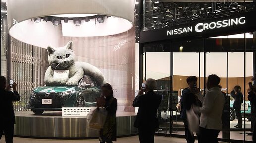 Компания Nissan разместила в шоуруме Nissan Crossing на токийской Гиндзе трёхметровую статую кота, созданную художницей Хоё Сато. Фигурка выполнена по образу британской короткошёрстной породы и весит около 20 кг. Шерсть имитирует реальную текстуру, а ночью кот мягко светится, превращаясь в сюрреалистический элемент городской витрины. Статую «посадили» на крышу новой модели Nissan Aura — лапы даже специально согнули, чтобы кот «вписался» в габариты автомобиля. Перформанс стал частью выставки, которая продлится до 25 декабря...