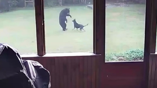 Необычная реакция овчарки на появление дикого медведя во дворе