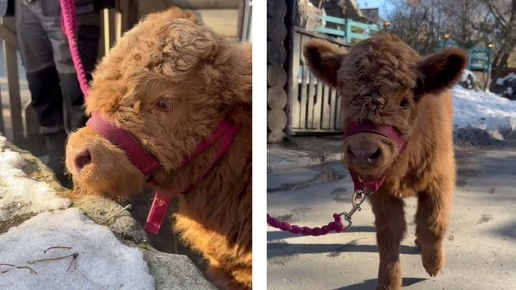 В Новосибирском зоопарке родился детеныш редкой породы коров с необычной внешностью. Видео с прогулки кудрявого теленка поделилась постоянная гостья зоопарка Анна Новикова. Маленький теленок породы хайленд активно исследует новое пространство. Для того, чтобы доставить малыша к матери, работники зоопарка используют специальный розовый недоуздок с поводком...