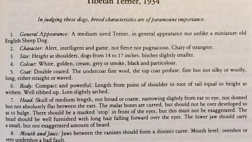 Стандарт породы 1934 года в Великобритании и несколько интересных фотографий— из книги Angela Mulliner's «Тибетский терьер». Британский стандарт тибетского терьера, 1934 При оценке этих собак породные характеристики имеют первостепенное значение. 1. Общий вид: Терьер среднего размера, внешне напоминающий миниатюрную староанглийскую овчарку. 2. Характер: Бдительный, умный и смелый, не агрессивный и не драчливый. С опаской относится к незнакомцам. 3. Размер: Высота в холке: кобели от 14 до 17 дюймов (35,56 до 43,18 см), суки немного меньше...