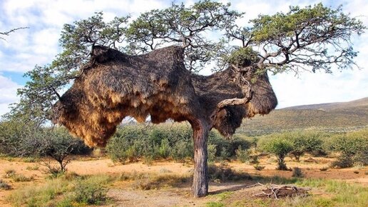 Самые большие гнезда. Обыкновенный ткач. Обыкновенные ткачи — птицы на удивление трудолюбивые. Родом из Южной Африки, Намибии и Ботсваны, ткачи строят гигантские многоквартирные гнезда, которые могут вмещать в себя сотни птиц на несколько поколений. Эти жилые гнезда, сплетенные из палок и травы, являются долговременными и обеспечивают постоянную тёплую температуру в внутренних слоях по ночам, что позволяет птицам не замерзнуть. Эти гнезда обычно достигают веса в сотни килограмм и ширины в 7 метров...