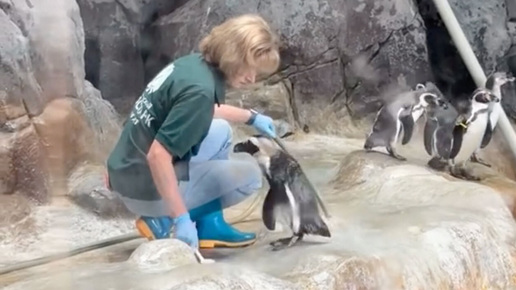 Посетители Московского зоопарка сумели снять на видео трогательный момент и поделились им в социальных сетях. На видеозапись обратил внимание Telegram-канал «Новости Москвы». На кадрах оказался запечатлен один из очковых пингвинов рядом с сотрудницей зоосада, которая проводила уборку вольера. Пока работница орудовала щеткой, морская птица аккуратно приблизилась к ней в приливе нежности. В свою очередь женщина не растерялась и приласкала животное. Объятия пингвина и кипера растрогали москвичей и гостей столицы в социальных сетях...