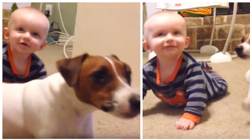 Собака учит младенца ползать
