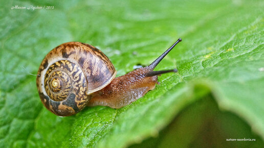 Наверное не ошибусь, если назову ее самой обычной наземной улиткой в Средней Полосе России. Раковина относительно большая и круглая, её размер от 13 до 25 мм, с 5 - 6 оборотами. Встречается, в основном во влажных биотопах, с высокой травой: луга, кустарники, опушки лесов и т.п. Окраска раковины довольно разнообразна. Данный вид часто встречается на двух кормовых растениях – крапиве двудомной (Urtica dioica) и таволге, или лабазнику (Filipendula ulmaria), где они сидят на листьях. Причем их совершенно безразличны жгучие волоски крапивы...