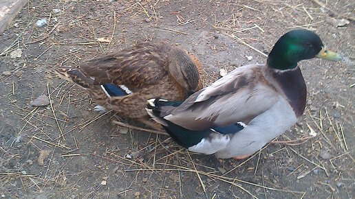 Приветствую вас читатели. В моем хозяйстве появились утки кряквы. Этих уток я увидела у знакомой. Во дворе купались 40 маленьких коричневых уточек. Среди них мелькали селезни в ярких изумрудных манишках. Размером они небольшие. Я в них влюбилась. И всю осень мечтала их купить для разведения. Осенью - в ноябре, я привезла уточек домой. Поселила их в клеточку в сарае. Зиму они перезимовали хорошо. В солнечные дни, я выпускала их на прогулку во двор. Это самая красивая парочка из всех уток...