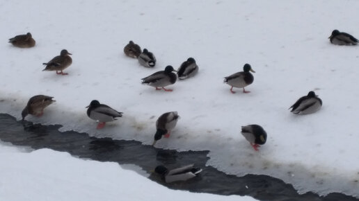 Привет, читатели и гости моего канала! В выходные во время прогулки зашли в микрорайон, где можно покормить уток. Часть уток прилетает сюда с других водоемов, но большинство живет на речке постоянно. Последний раз мы были здесь в декабре, речка не была замерзшей, лишь местами была покрыта льдом. Утки свободно плавали. Когда вчера мы пришли кормить уток увидели, что вся речка замерзла. Только у берега есть небольшие проталины. Утки сидят рядом на снегу, походят к воде только попить. Плавать им негде, совсем нет места...