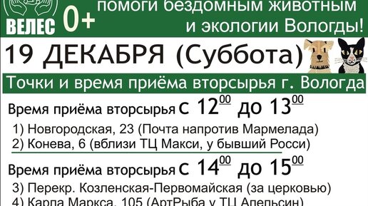 19 декабря общество защиты животных "Велес" организует последнюю в этом году акцию "Вторсырье во благо жизни". В этот день, помимо традиционного приема вторсырья и гуманитарной помощи для животных, волонтеры организуют сбор товаров для благотворительной ярмарки и раздачу адресников...