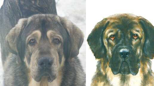Слева - испанский мастиф Bulco del Rabio. Справа - меделян, рисунок Марины Ефремовой, представление художницы. Листайте карусель. Как видим, сходство есть, но "с натуры" рисовался лишь меделян на последней карточке...