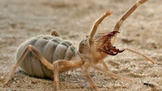 😱 Ладно, ладно, это всего лишь миф. То, что их часто находят рядом с мёртвыми верблюдами, — просто совпадение. Если вы верите в подобные вещи... На самом деле это не пауки, а более древняя ветвь семейства паукообразных. Они питаются пауками, скорпионами, ящерицами, мышами, а иногда и птицами. Они не ядовиты, но их челюсти могут нанести очень болезненный укус. Они убивают добычу, разрывая её на части...
