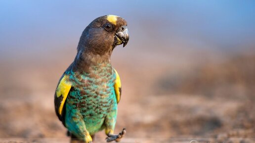 Вид назван в честь Бернхарда Мейера, немецкого ботаника и орнитолога. Длина тела 21—25 см, хвоста 5—6 см. Окраска верхней части тела буровато-серая с зеленоватым оттенком. Нижняя часть тела и крестец сине-зелёные. На голове, бёдрах и кроющих перьях крыла имеются жёлтые пятна. Клюв чёрный. Радужка оранжево-красная. Самец и самка по окраске не отличаются. Наши знания о питании птиц постоянно развиваются. Это связано как с повышенным осознанием важности питания, так и с расширением исследований различных потребностей птиц...