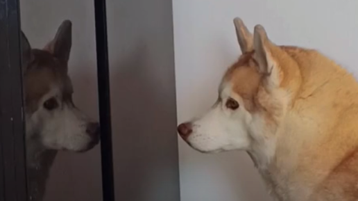 К сожалению, пока что достоверно неизвестно, узнаю́т ли собаки себя в зеркале и как именно воспринимают свое отражение (как картинку/кино, реальную другую собаку за стеклом и т.д.) Существующие тесты и эксперименты не дают однозначных результатов с собаками. Например, обезьянки стирают с себя нарисованные им краской пятна, увидев своё отражение в зеркале. В отличие от собак :) Таким образом, собаки, кажется, не обращают внимания на изменения в своей внешности в отражении. Но неизвестно наверняка...