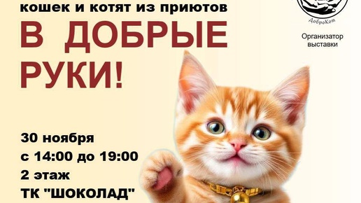🐈ДРУЗЬЯ! Мы рады сообщить ,что 30 ноября 2025 года с 14.00 до 19.00 в ТК ШОКОЛАД по адресу: г. Реутов, МКАД, 2 км, д.2 состоится выставка-пристройство кошек и котят из приютов «В ДОБРЫЕ РУКИ»! Организаторы выставки - Благотворительный фонд помощи животным "ДоброКот" и ТК ШОКОЛАД. Все наши питомцы спасены с улицы, ухожены, красивы, умны и готовы ехать домой. Взрослые котики стерилизованы. -Если вы планируете выбрать котика, не забудьте паспорт и переноску. -Если вы пока не готовы обзавестись пушистым...