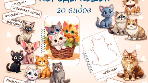 Получилось просто залипательное занятие для детей и взрослых. Сейчас подробно расскажу, как создать и играть в эту игру. За основу я взяла 20 пород милых кошечек У нас получится блокнот с 20 листами При распечатывании шаблона этой игры эти листы будут выглядеть так, как на рисунке ниже: Далее вырезаем виды кошек Их 20 штук. Таблички с названиями пород Пора играть Всё просто! Наша игра готова...