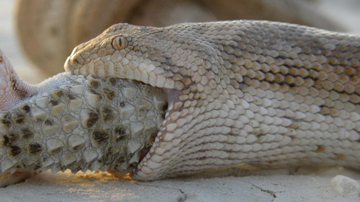 Рогатый гремучник, змея которая атакует ящериц из песка