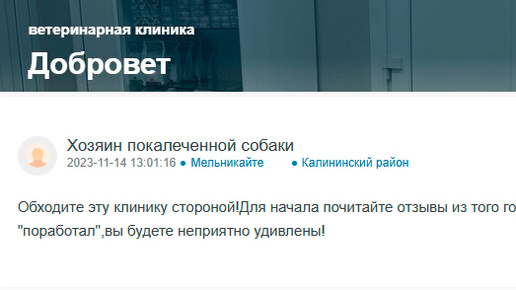 «Обходите эту клинику стороной!Для начала почитайте отзывы из того города где это недоврач 10 лет "поработал",вы будете неприятно удивлены!» Пишет - «Хозяин покалеченной собаки». Один из первых отзывов о клинике Добровет в Тюмени после переезда в конце 2023г. из Губкинского. Как известно один негативный отзыв стоит десятков положительных, и к ним нужно относится крайне внимательно. Этот отзыв можно посчитать пророческим, не прислушавшись к нему вы возможно совершите большую ошибку. 🙏 Конечно, к этому времени в 2GIS сочувствующие уже успели наклепать несколько штук положительных отзывов...