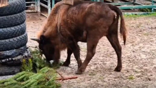 В ростовском зоопарке зубры доедают нераспроданные новогодние елки