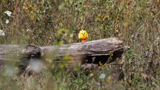 Продолжаем разговор про телеобъективы. Canon r10 имеет кроп-фактор 1.6, все цифры буду приводить брать за точку отчета именно число до перемножения на кроп-фактор. Мне в свое время очень не хватало понимания 300мм это сколько, а 400мм, а если 200мм то мне хватит или нет. Помогать нам будет птичка Цыпа. Размеры у него 7х5 см. Отправился я в поле, нашел подставку "бревно" для птички. Установил нашего желтого красавца, отсчитал около 20 шагов, сделал кадры на разных фокусных расстояниях. Начинаем смотреть результаты...
