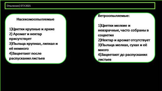 Опыление - перенос пыльцы с одного цветка на другой Цветки по признаку опыления подразделяют на ветроопыляемые и насекомоопыляемые Ветроопыляемые цветки имеют: 1)Цветки мелкие и невзрачные, часто собраны в соцветия 2)Нектар и аромат отсутствует 3)Пыльца мелкая, сухая и её много 4)Зацветают до распускания листьев Насекомоопыляемые цветки имеют: 1)Цветки крупные и яркие...