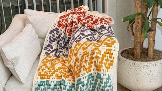 При вязании в этой технике получаются узоры, напоминающие мозаику (отсюда и название). В готовом изделии в каждом ряду чередуются два цвета, но в работе всегда один ряд вяжется одним цветом. В мозаичном вязании взят за основу тот же принцип, что и в ленивом жаккарде спицами (и иногда оно даже так и называется). В процессе работы используются только столбики с накидом и столбики без накида. Больше всего этой технике подходят простые (и не очень) геометрические узоры. Вязать можно поворотными рядами и по кругу, с обрезанием нити в каждом ряду и без...