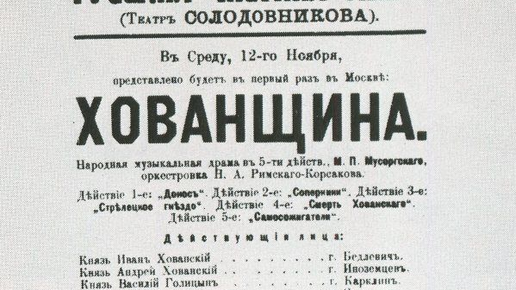 Одна из величайших русских опер, а точнее по выражению ее автора Модеста Мусоргского, народная музыкальная драма "Хованщина" имела в высшей степени драматическую судьбу. Как и все прочие оперы композитора, она не была им закончена и, соответственно, при его жизни не исполнялась. Первое московское исполнение оперы состоялось лишь в 12 ноября 1897 года, т.е. ровно 125 лет назад. Постановка была предпринята Русской частной оперой Саввы Мамонтова, в помещении театра Г. Г. Солодовникова. Художниками спектакля были Васнецов, Коровин и Малютин, Дорсифея пел Федор Иванович Шаляпин...