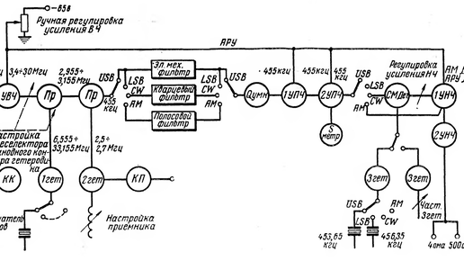 В журнале Радио №12 а 1963 год была помещена статья А. Портнягина (UA9CC) о требованиях, предъявляемых к современному (на тот момент) радиолюбительскому КВ-приемнику. Как пишет в начале статьи автор, наиболее распространенной к тому времени структурой построения ламповых приемников был такой: Два резонансных каскада УВЧ, перестраиваемые синхронно с гетеродином, обеспечивали избирательность по зеркальному каналу. Избирательность по соседнему каналу обеспечивал кварцевый фильтр или ЭМФ. Затем - два...