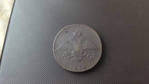 А это обзор большой медной монеты номиналом 10 копеек. Вообще, 10 копеек в меди это довольно интересное явление. Какие медные монеты выпускались в таком номинале? Например, сибирские. А еще так называемые "барабаны". В 19-м веке только лишь при Николае Первом чеканились медные 10 копеек. И вот такая монетка лежит у меня в альбоме: Это 10 копеек 1834 года ЕМ ФХ. Сразу же можно сказать, что рельеф у монеты отличный, а вот поле имеет слишком много "рытвин". Но деваться некуда - что есть, то есть...