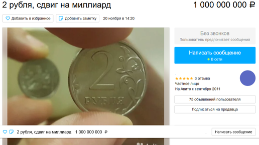 Итак, 2 рубля 2016 года ММД (Московский монетный двор) по Таганскому ценнику стоят-ровно два рубля. Что касается браков, то монеты с поворотами можно найти от 200 до 3000 рублей, в зависимости от жадности продавца. В нашем конкретном случае жаба полностью победила пациента и он потерял грань реальности, выставив цену в миллиард рублей...