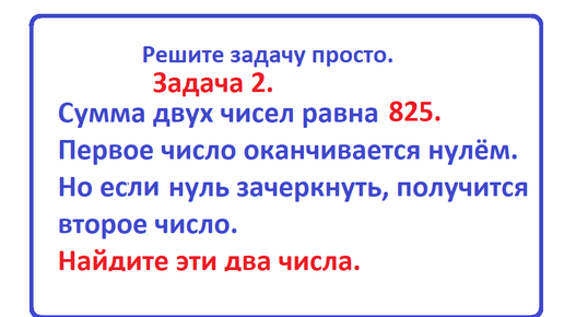 Приветствую читателей и подписчиков канала Тесты_математика! Предлагаю рассмотреть две числовых задачи, которые при умении можно решить даже устно. Задача про числа 1. Сумма двух чисел равна 715. Первое число заканчивается на ноль (0). А если этот ноль зачеркнуть, получится второе число. Найдите эти числа. Решите аналогичную задачу немного с другим условием. Задача про числа 2. Сумма двух чисел равна 825...