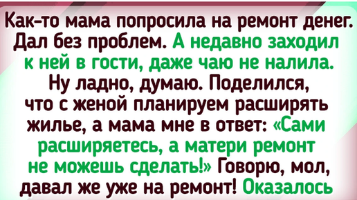 Супруг оформил займ на подарок своей маме, договорившись с братом делить выплаты поровну. Брат предложил: «Запиши кредит на себя, а я каждый месяц буду переводить свою часть». Брат с гордостью дарил подарок и принимал поздравления. После этого переводить деньги мужу прекратил — мол, получает немного, детей надо кормить и всё такое. А чуть позже всей семьёй укатил отдыхать в Турцию. Вот такая история. © mariya_kurman Зря сообщил родителям о размере своего дохода. Теперь любой разговор сводится к финансовым вопросам...