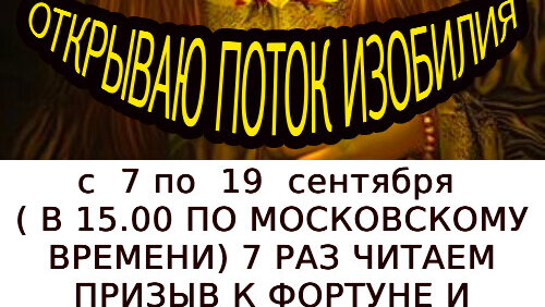 с 7 по 19 сентября ( В 15.00 ПО МОСКОВСКОМУ ВРЕМЕНИ) 7 РАЗ ЧИТАЕМ ПРИЗЫВ К ФОРТУНЕ И 49 РАЗ БЛАГОДАРИМ !!!!!!