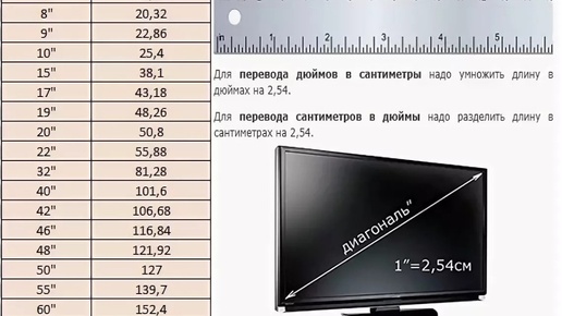 Очень часто при покупке мебели и расчету пространства в квартире или на офисе требуется понимать сколько места занимает телевизор. Все знают его диагональ в дюймах, но не многие знают какова его ширина и высота в сантиметрах.Данная таблица создана для упрощения конвертирования диагонали экрана в высоту и ширину в сантиметрах.ВАЖНО! Данные в таблице и диагональ экрана показывает только размер самой матрицы исходя из соотношения сторон 16:9 без учета рамок телевизора...