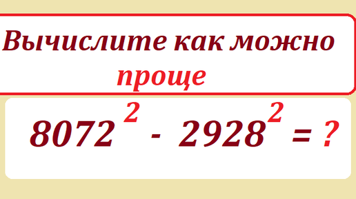 Приветствую читателей и подписчиков канала Тесты_математика! Рассмотрим ещё задачу на рациональное вычисление числовых выражений. Задача. Вычислите как можно проще это выражение 8072^2 - 2928^2. Проще вычислит, значит, нужно применить какие-то методы упрощённого вычисления числовых выражений. Таким методом можно считать разность квадратов. a^2 - b^2 = (a + b) * (a - b). Вот и применим эту формулу, возможно это поможет проще вычислить. 8072^2 - 2928^2 = (8072 + 2928) * (8072 - 2928) = 11000 * 5144 ...