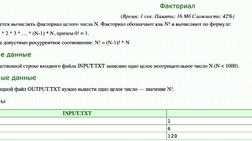 Решим сложную задачу на двух языках. Читаем условие: Алгоритмически решается задача очень просто: надо перебрать все числа от 1 до n и перемножить их. И именно так и надо делать. Например на Python. Считаем входное число и приведём его к числовому типу: Затем заведём переменную, в которой будем накапливать ответ. И инициализируем её единицей. Обращу внимание, что не нулём, потому что будем домножать её, а не прибавлять к ней. И запустим цикл, в котором выполним умножения: Осталось вывести ответ: И этим решением легко сдать задачу...