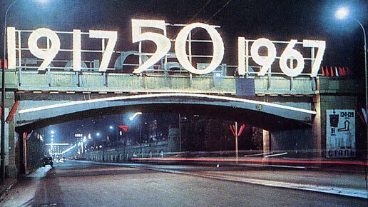 Сегодня понедельник, а это значит, что я говорю вам: "Добро пожаловать в прошлое!". Мы вновь отправляемся на прогулку по историческому Ленинграду и сегодня переносимся в 1967 год: 50 лет Октябрьской революции, официально введена 5-дневная рабочая неделя, а на экраны страны выходит легендарная "Кавказская пленница". Итак, начинаем: как я уже сказал, в этот год активно праздновали 50-летие Октябрьской революции. Вот так был украшен путепровод у Кировского завода. А вот такое произведение революционного искусства установили на площади Восстания...