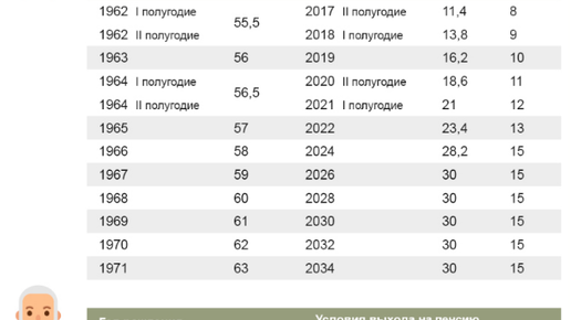 Прежде чем узнать условия получения статуса пенсионера людям 1971 года рождения, нужно разобраться в самом процессе реформирования. Поскольку изменения трудоспособного возраста будут осуществляться плавно, для большого количества граждан требуются разъяснения, касающиеся данного вопроса. Согласно информации от пенсионного фонда РФ возраст выхода на пенсию госслужащих мужчины-госслужащие к 2028 году будут выходить на пенсию в 65 лет, женщины-госслужащие с 2034 года – в 63 года. График выхода на пенсию...