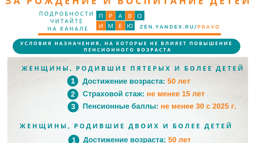 Досрочно страховая пенсия по старости назначается матерям за рождение и воспитание детей в четырех случаях, в двух из них повышение пенсионного возраста не влияет на установление пенсии. Канал ПРАВО ИМЕЮ разбирался в деталях...