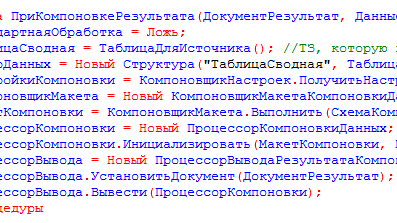 Если для формирования отчета используются данные, которые невозможно получить запросом, можно использовать "набор данных - объект" 1) В модуле отчета инициируем предопределенную процедуру "ПриКомпоновкеРезультата" и вставляем в нее следующий код: Процедура ПриКомпоновкеРезультата(ДокументРезультат, ДанныеРасшифровки, СтандартнаяОбработка) СтандартнаяОбработка = Ложь; ТаблицаСводная = ТаблицаДляИсточника(); //ТЗ, которую засунем в СКД НаборДанных = Новый Структура("ТаблицаСводная", ТаблицаСводная); НастройкиКомпоновки = КомпоновщикНастроек...