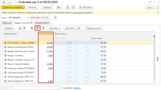 В программе "1С:Управление нашей фирмой", начиная с версии 3.0.5 при назначении цен можно быстро проверить, есть ли товар в наличии без дополнительных отчетов. В документе «Установка цен номенклатуры» появился режим «Око» (Показать остатки). Режим включается по кнопке с изображением глаза (см. рис.) и позволяет сразу увидеть свободные остатки товара на складах. Есть возможность увидеть остатки в разрезе характеристик. Для этого нужно перейти к характеристикам номенклатуры через пиктограмму увеличительного стекла в режиме «око»...