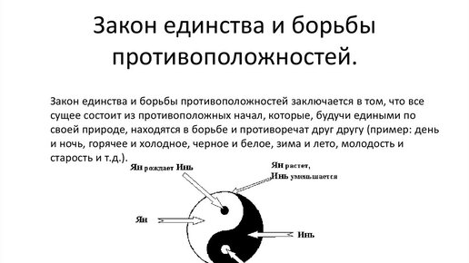 На законе единства ( и борьбы) противоположностей построено всё мироздание. Это главный закон Природы. Закон открыт как "закон единства и борьбы противоположностей" греческими натурфилософами более двух тысяч лет назад ( Гераклит Эфесский, VI век до н.э.) "Гераклит учит, что все изменения в мире происходят в результате активных циклических взаимодействий различных пар противоположностей и рассматривал каждую такую пару как единое целое. Единство, содержащее противоположности, но стоящее над ними, он называл логосом" ( Ф...