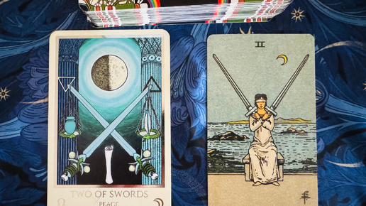 Здравствуйте! Двойки на то и двойки, что понять точно и однозначно о чем они, не всегда получается. Несмотря на то, что многие говорят об уравновешенности и "реальности" двойки мечей, о том, что она беспристрастная, прямая и четкая, я придерживаюсь другого, противоположного мнения. Но объективности ради отмечу, что некоторые толкователи видят Двойку как твердую, с балансом, как систему "сдержек и противовесов", точную и реальную. Скорее всего тут играет роль сходство с Правосудием - закрытые глаза и мечи-сила в руках...