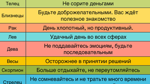 Овен. Овны сегодня пребывают в недобром расположении духа. Не стоит принимать все близко к сердцу и совершать поспешные действия. Телец. Тельцы сегодня находятся в переживаниях. Старайтесь сохранять спокойствие и не принимайте непродуманных решений. Близнецы. Близнецы сегодня активны. Проявляйте решительность, вы в шаге от победы. Рак. У раков сегодня может выдасться плодотворный день. Проявляйте практичность и трудолюбие, но не забывайте об отдыхе. Лев. Львы сегодня полны сил и энергии. Берите инициативу в свои руки, проявляйте решительность и смело идите к новым горизонтам...
