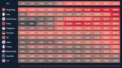 В таблице - изменение, неделя 2020 года к соответствующей неделе 2019 года. Видно, что ситуация по миру в целом пока не такая критичная, -12% на начало предыдущей недели (данные за прошедшую неделю ещё не появились). Серьёзнее всего ситуация в Гонконге, где объём авиаперевозок упал в 5 раз, и в Италии: в 4 раза. Основной пик снижения в Китае, кстати, уже прошёл, и сейчас это "всего-то" минус 40% по сравнению с прошлым годом. И на самом деле это довольно позитивная новость, что восстановление занимает не так чтобы очень много времени...