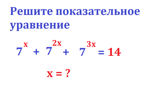 Приветствую читателей и подписчиков канала Тесты_математика! Предлагаю к рассмотрению решение показательного уравнения. Условие задачи. Решите это показательное уравнение: 7^x + 7^2x + 7^3x = 14 Условие задачи в рисунке. Рассматриваем 7^x. как переменное? (7^x) + (7^x)^2 + (7^x)^3 = 14. Представим 14 в виде. 14 = 2 + 4 + 8. Переносим эти слагаемые вправо, получим. (7^x) + (7^x)^2 +...